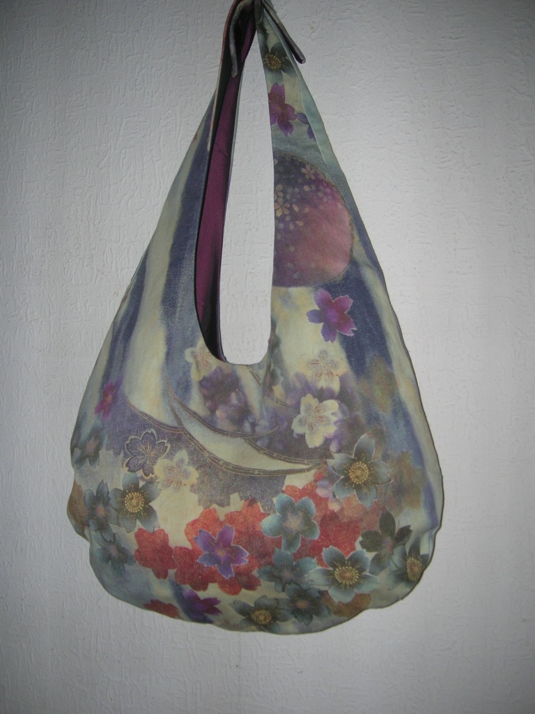 Besace grande taille en Jean imprimé - modèle unique - doublure taffetas violet, deux poches avec zip lavable